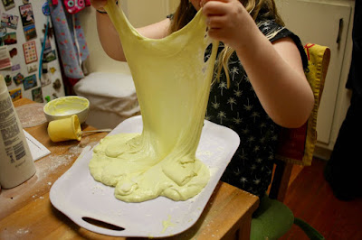 We've had a lot of slime in the house lately. Sylvia has become a bit of an expert at slime using glue, activator and shaving cream. I borrowed a book from the library called "101 kids activities that are the ooey, gooey-est ever!" I bought her ingredients for a complicated butter slime (yes there are many types of slime): saline contact liquid, baby powder, hand lotion, oil, shampoo, bicarb soda, shaving cream and of course butter. The recipe in the book didn't work as hoped and Sylvia had to doctor it to get it coming up in a curtain.