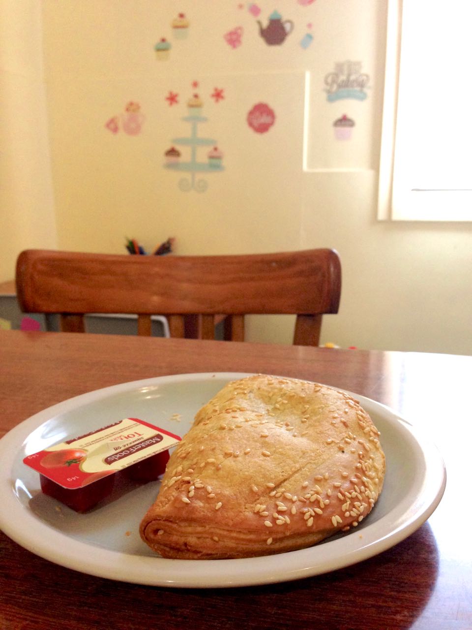 Vegetable pastie. Meringue monster, coffee scroll and chocolate doughnut.
