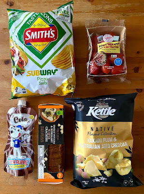 We still find interesting groceries at our local supermarket. Sylvia loved the Subway pizza sub flavoured Smiths crisps. I enjoyed the native flavours of the Kakadu Plum and Australia Aged Cheddar Kettle crisps. I also enjoyed the sweet potato and rosemary wafer crackers. The baby roma tomatoes are in the photo because I was surprised to see them in a cardboard box rather than the usual supermarket plastic tubs. And Sylvia got the Cola Slush Puppy but it is still in the freezer so I can't report back on it.